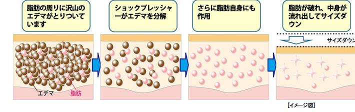 強いエネルギーをセルライトに到達させて、 脂肪のまわりに取りついた老廃物「エデマ」を取り除きます。 さらに脂肪細胞自身にも作用して、内部の遊離脂肪酸を細胞の隙間に流し、サイズダウンを目指します。