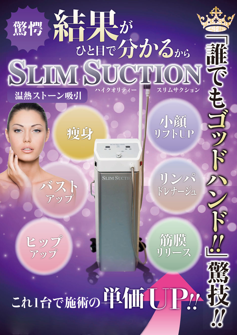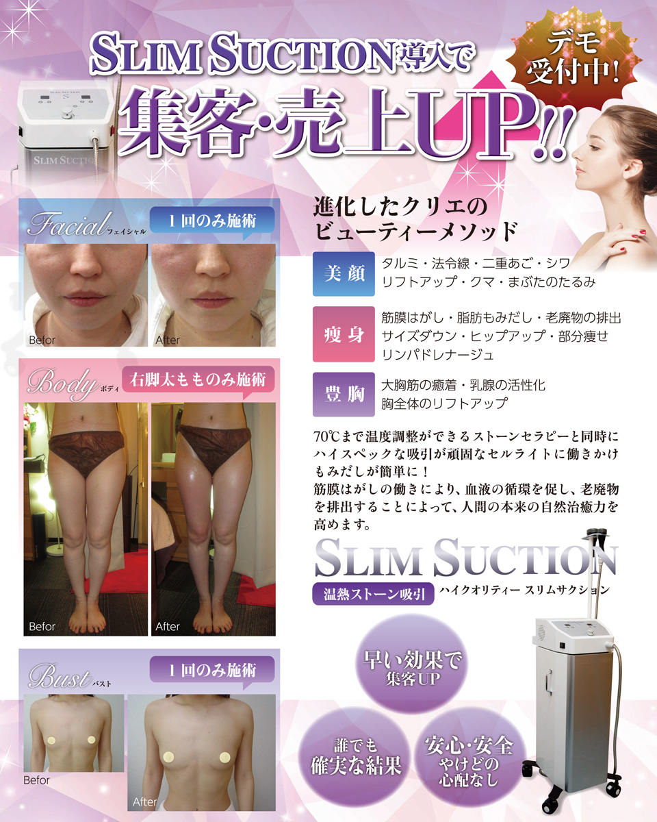 スリムサクションは、1台で3役、痩身、美顔、豊胸とこれ1台であらゆるサロン様のニーズにお応えできる安心、安全な最新の機器です。